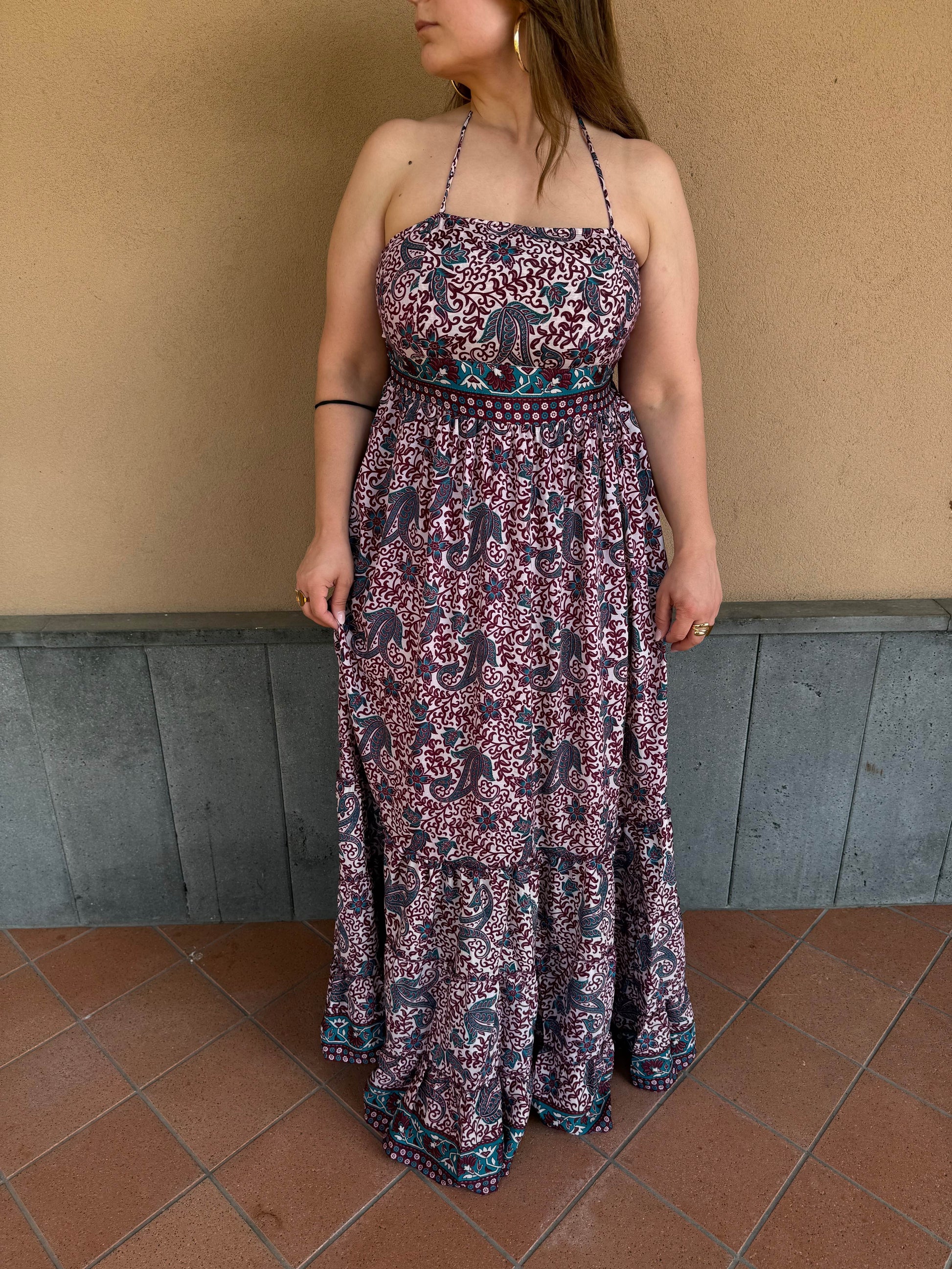 Abito lungo con maxi balza sul fondo, laccetti al collo regolabili con dettaglio pendente, laccetto sul retro regolabile, banda elastica.