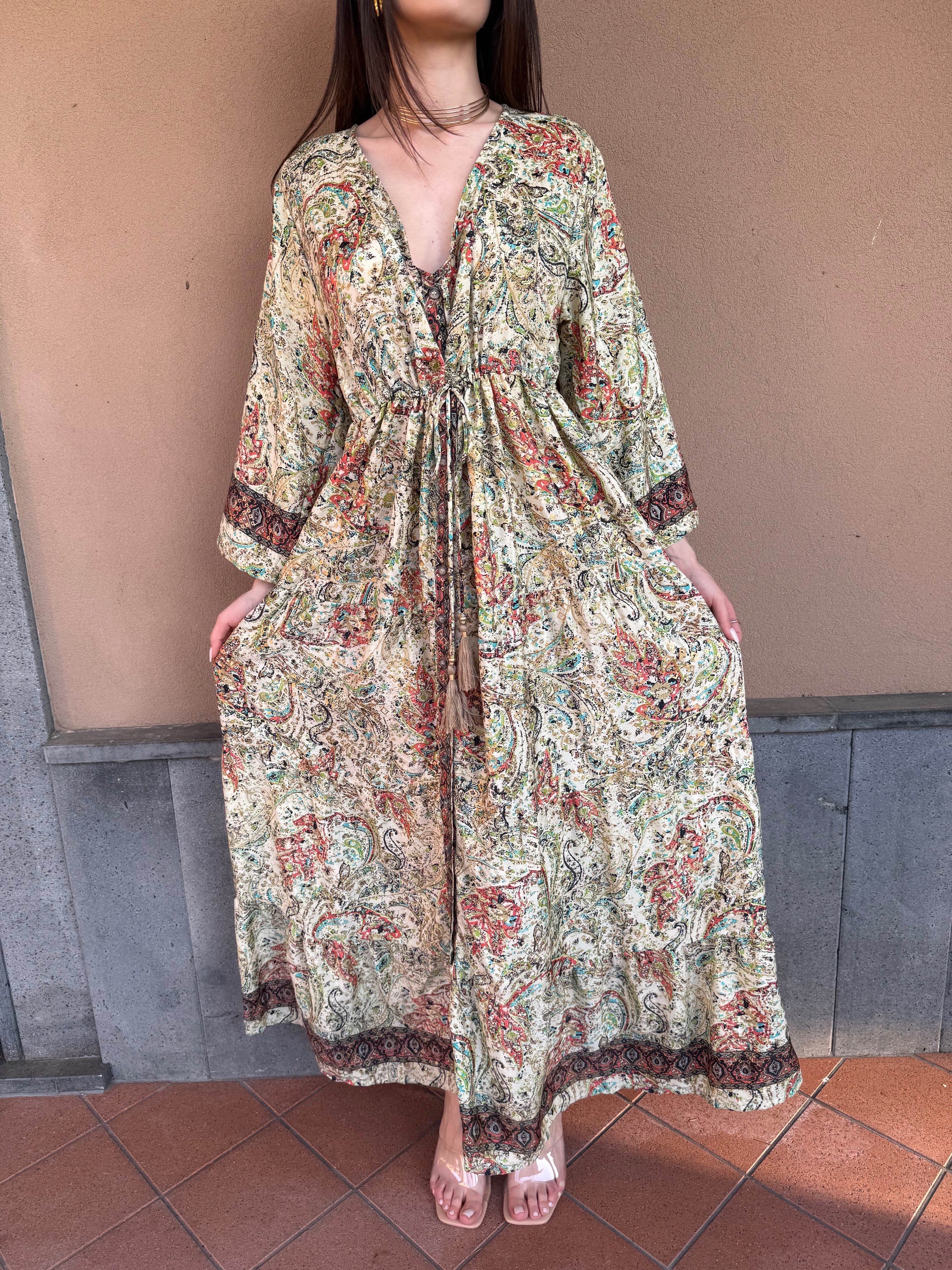 Abito lungo chemisier con bottoncini sul davanti, scollo a V, laccetto in vita regolabile con dettaglio, manica a 3/4, balza sul fondo.