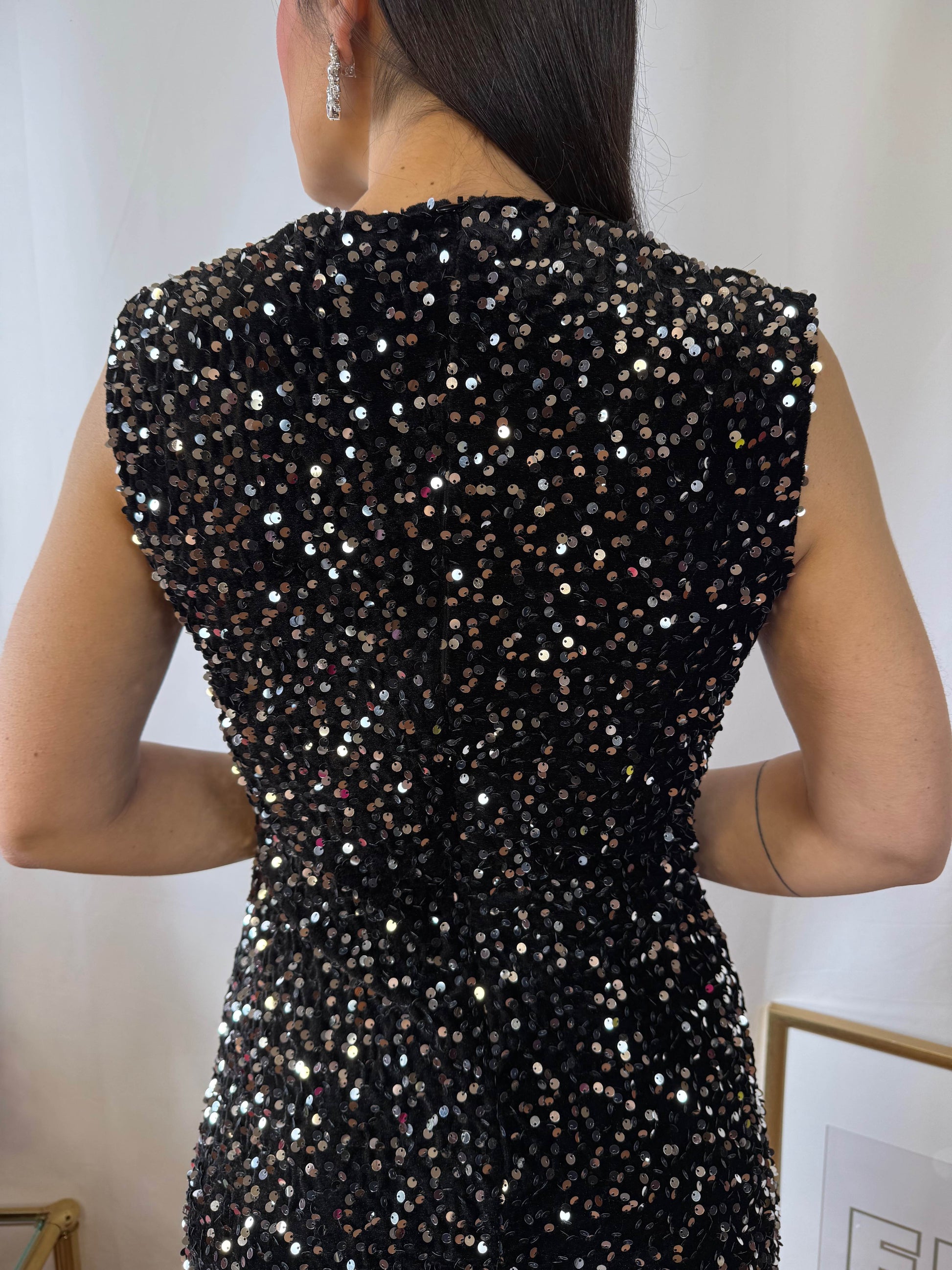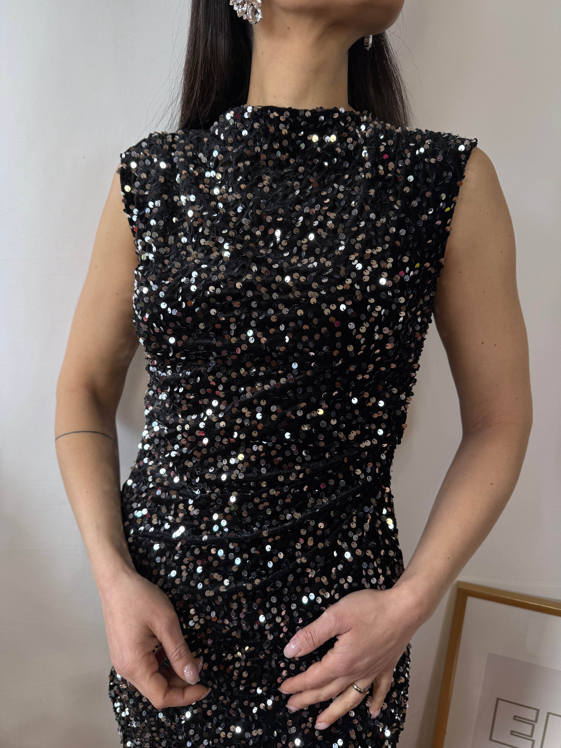 Abitino tubino smanicato in paillettes, fondo effetto ciniglia, drappeggio in vita, cerniera sul retro,fodera interna, elasticizzato .