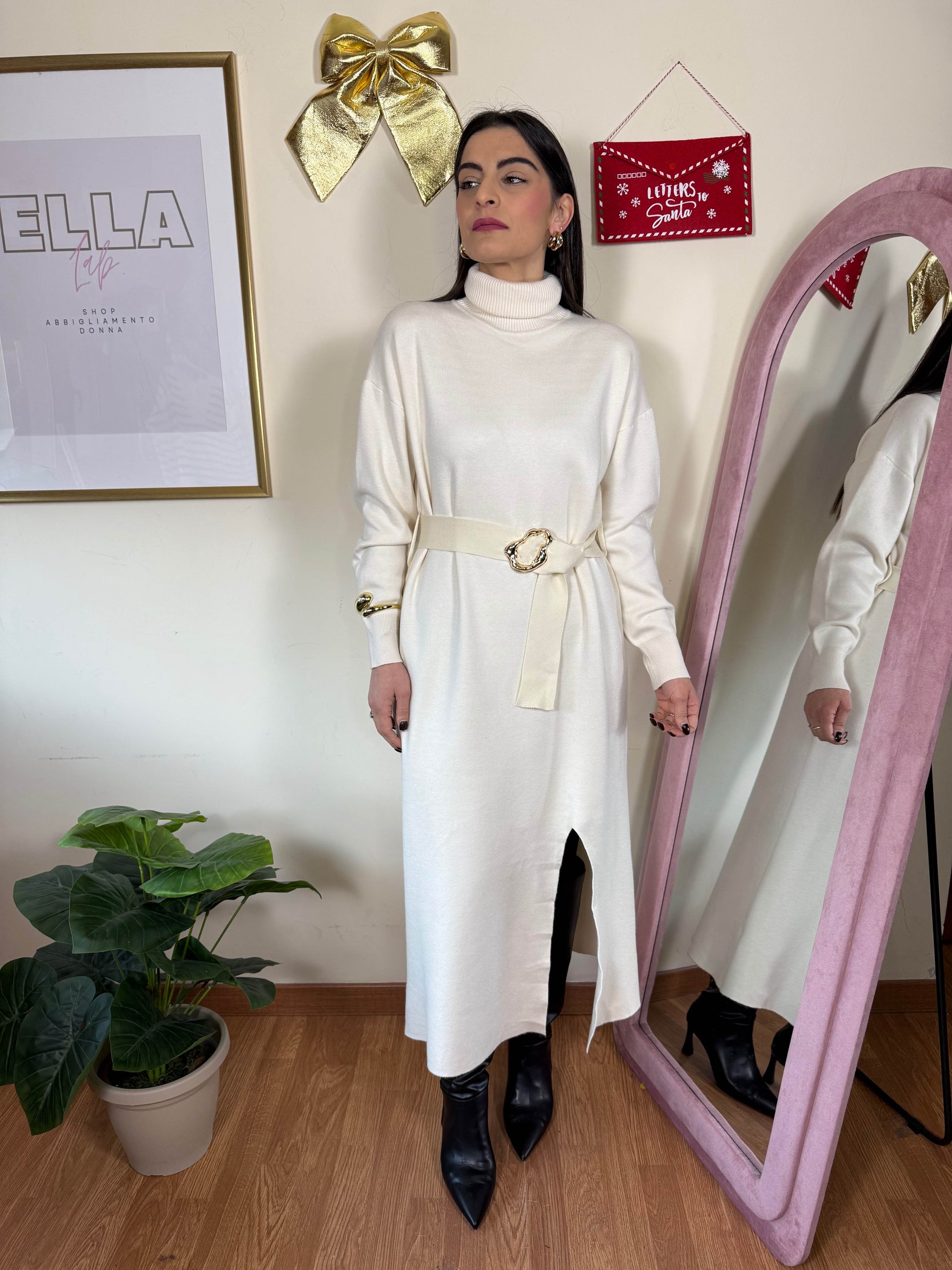Abito lungo in maglia, dolcevita, spacco laterale,cintura con dettaglio oro.