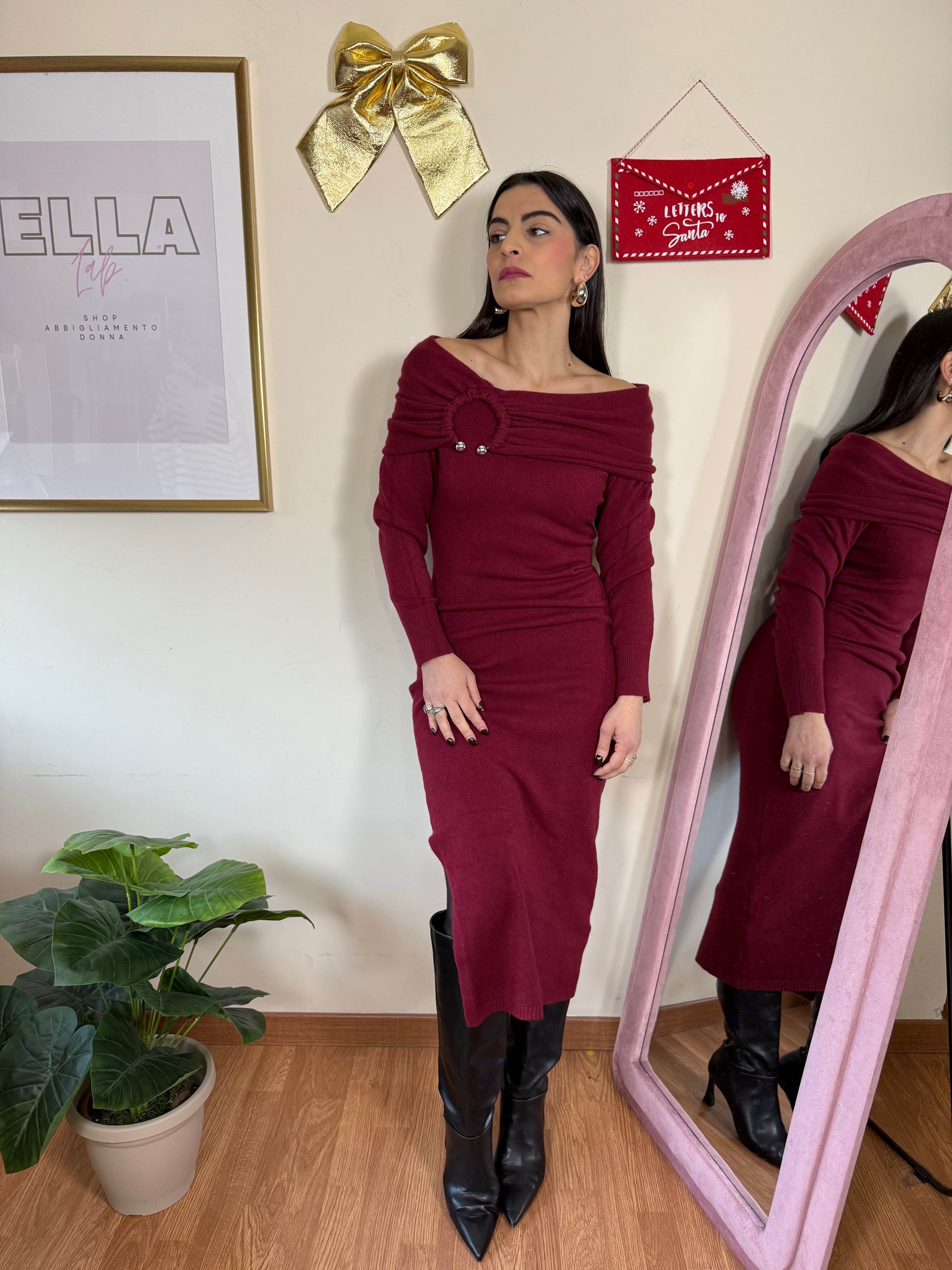 Abito in maglia con scollo a barca, dettaglio gioiello, spacco laterale, elasticizzato .