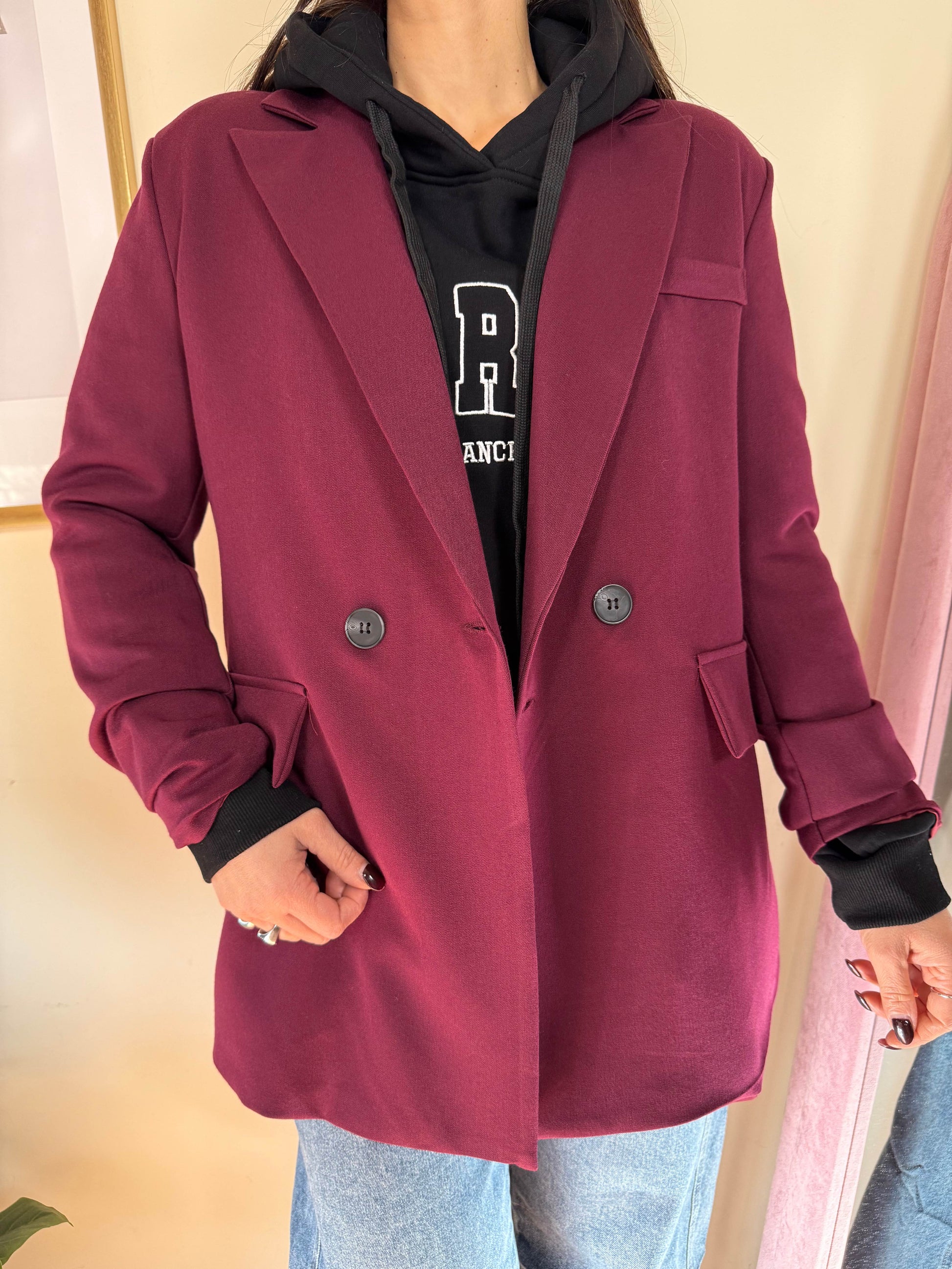 Blazer over doppiopetto,spallina imbottita, tasche laterali, fodera interna.