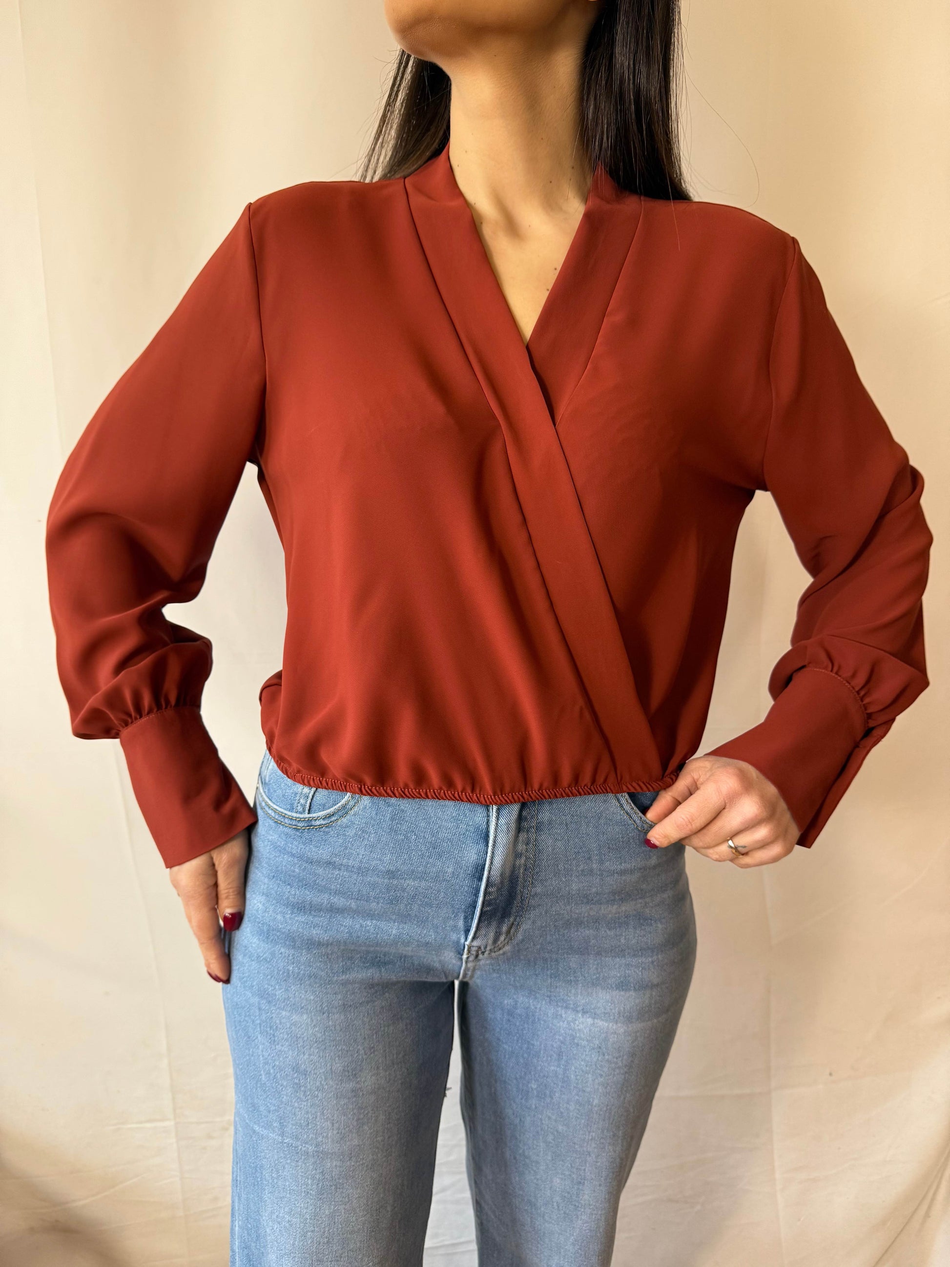 Camicia crop, con scollo a V ad incrocio, elastico sul fondo, maxi polsino con bottoncino foderato.