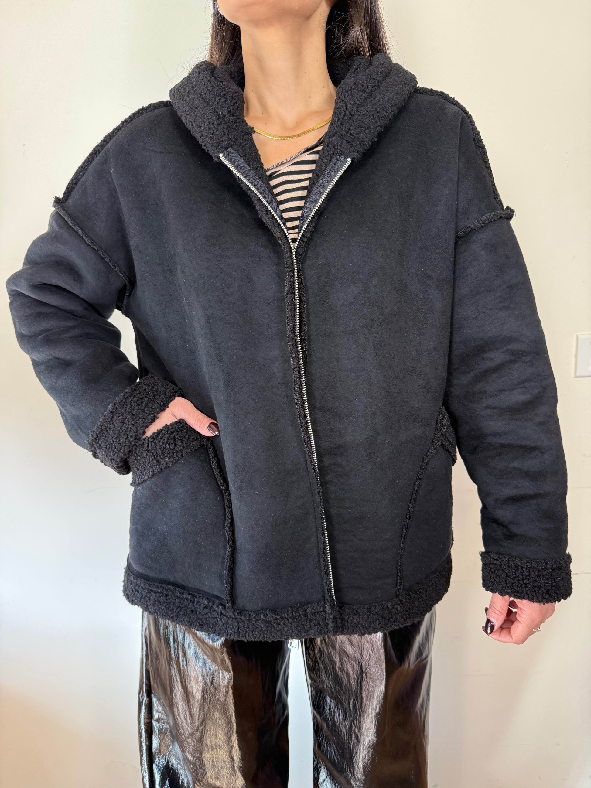 Cappotto scamosciato con cerniera e cappuccio,interno effetto teddy, tasche sul davanti.