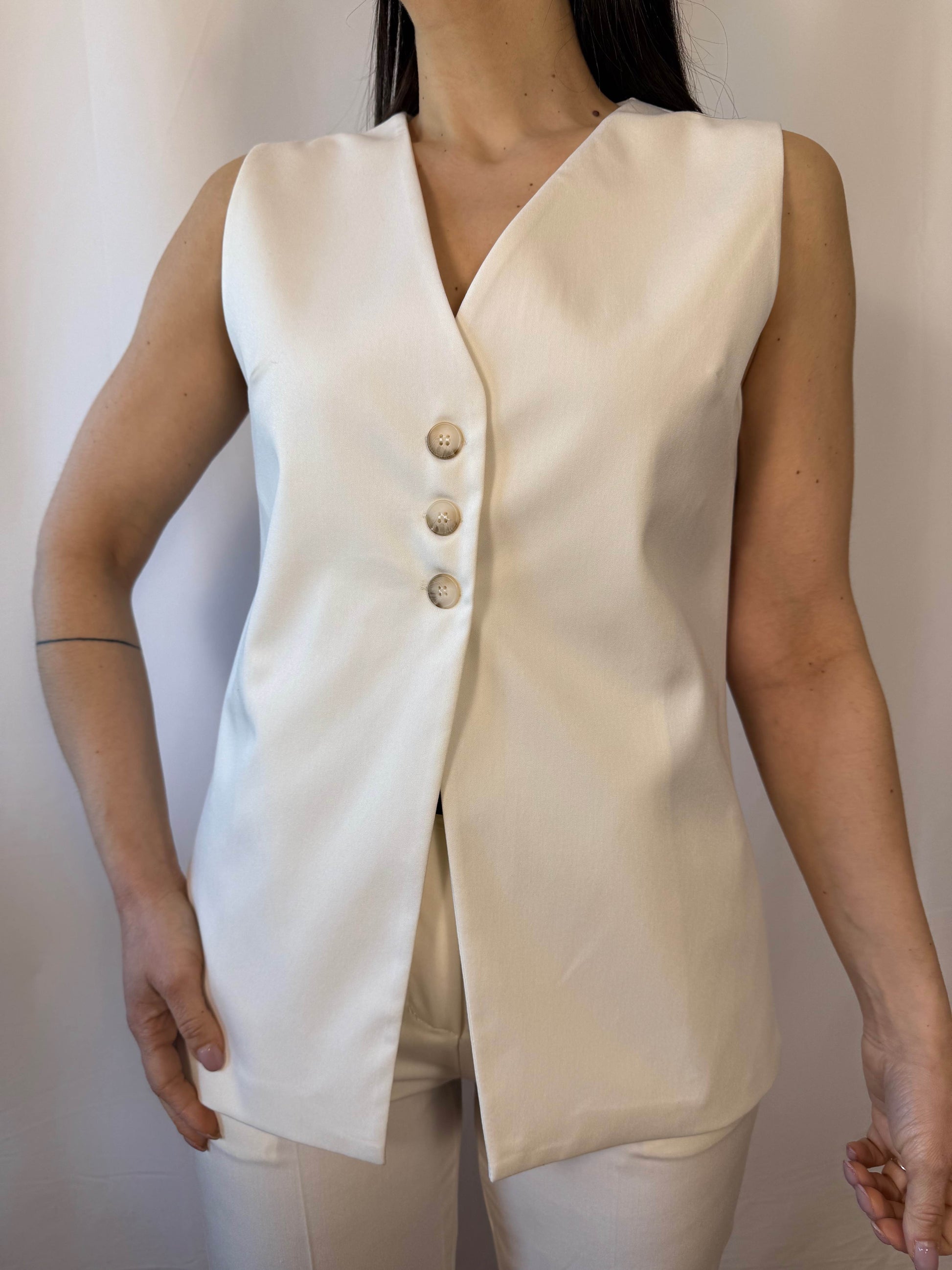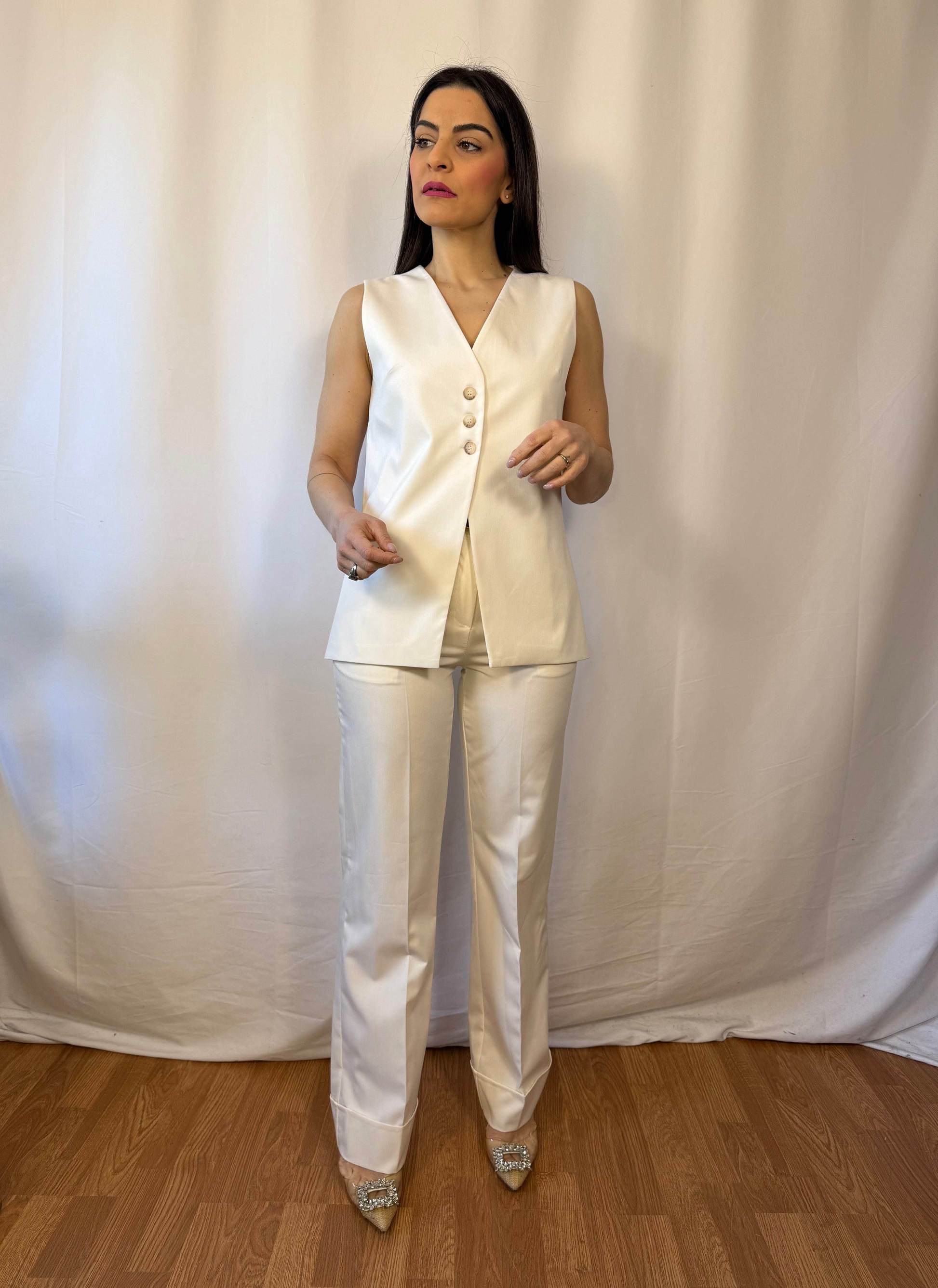 Gilet smanicato, strutturato con tre bottoni, pantalone vita alta con tasche laterali, cintura inclusa, fondo con risvolto.