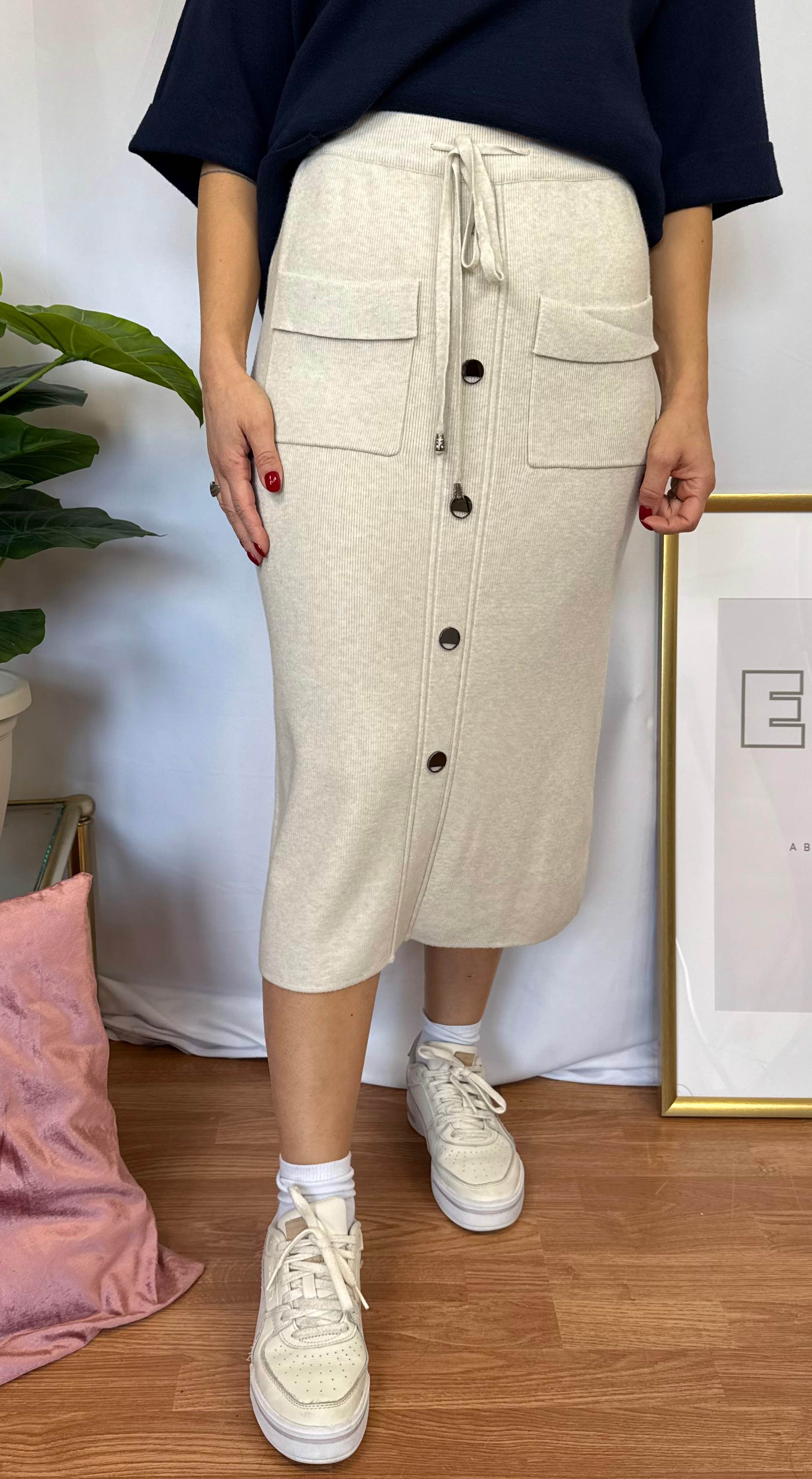 Gonna midi in maglia, elastico in vita, laccetto regolabile, tasche sul davanti, bottoni finti in metallo, spacco sul retro.