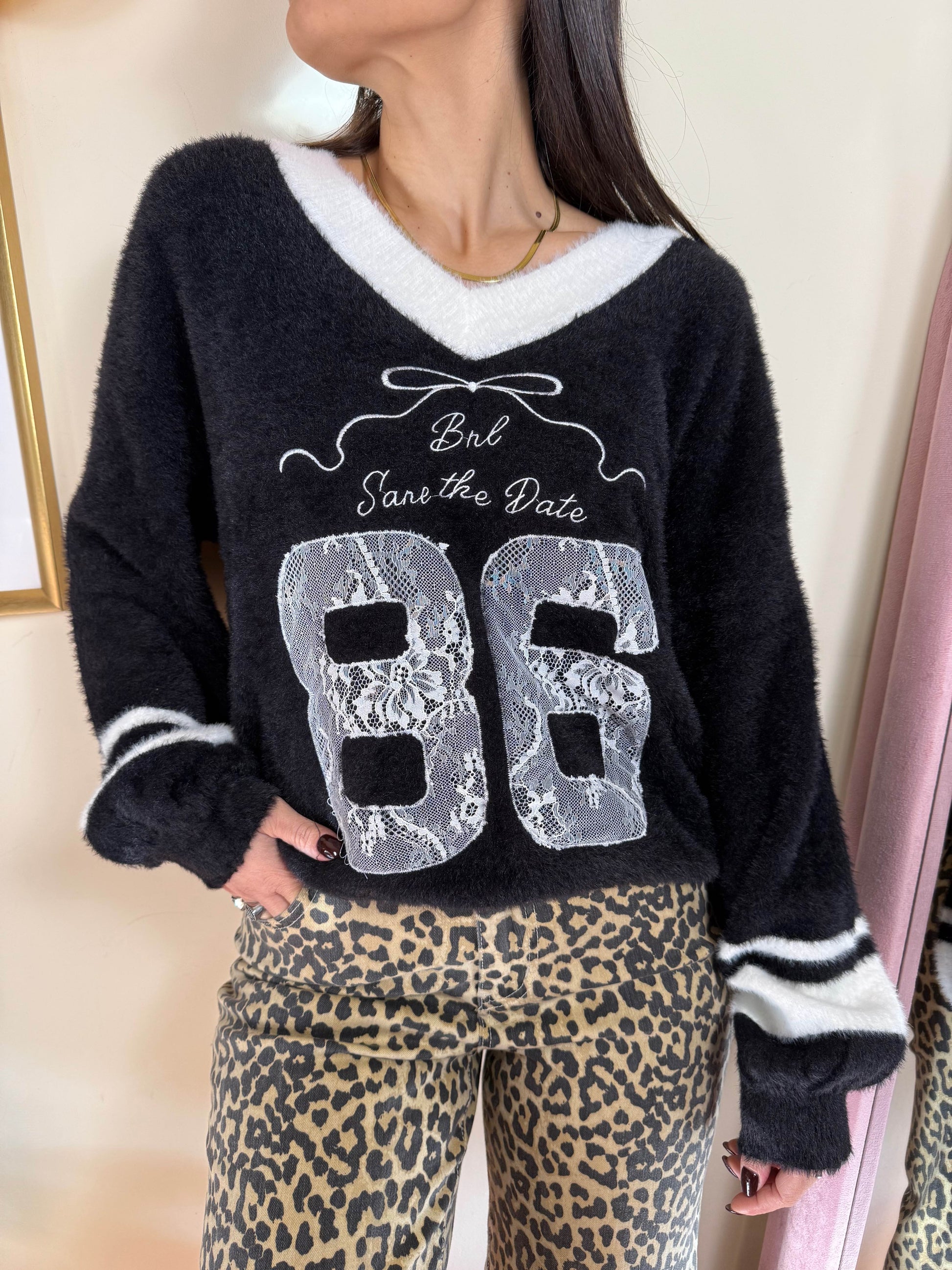 Maglioncino con scollo a V effetto peluche, dettaglio ricamo e pizzo sul davanti.