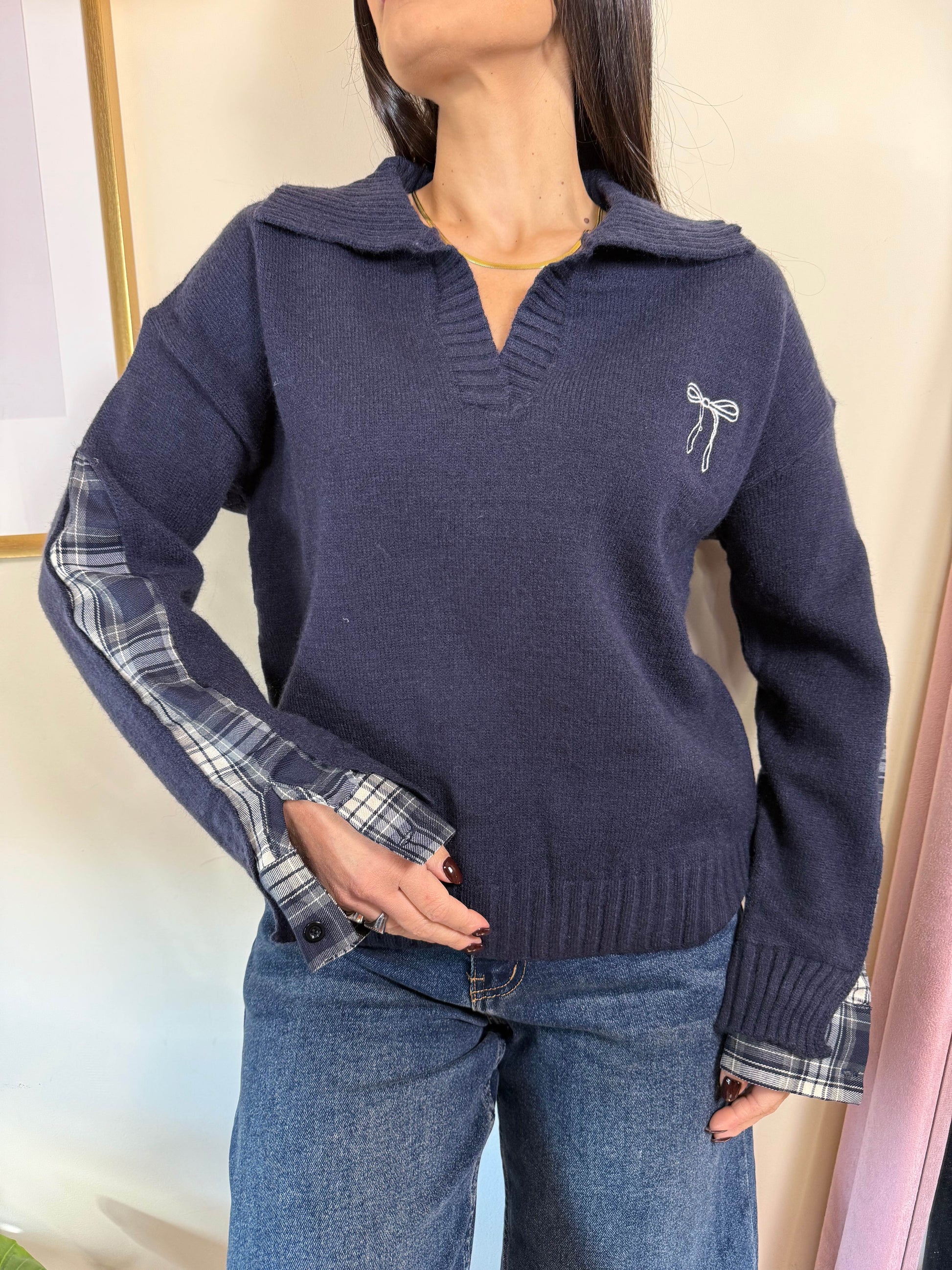 Maglioncino scollo a V e colletto, dettaglio finta camicia sulle maniche, ricamo sul davanti.