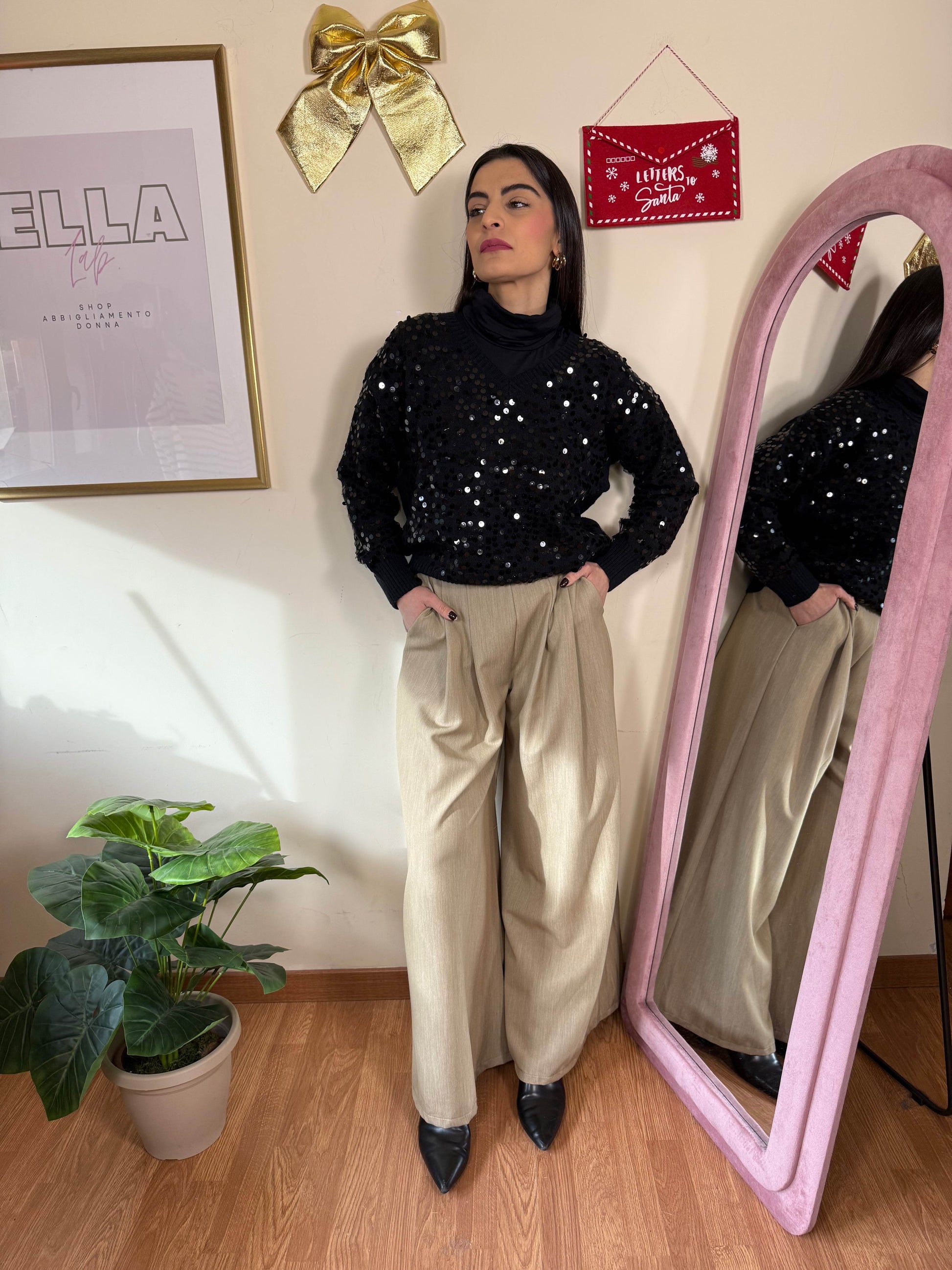 Maglioncino scollo a V, dettaglio maxi paillettes a specchio sul davanti.