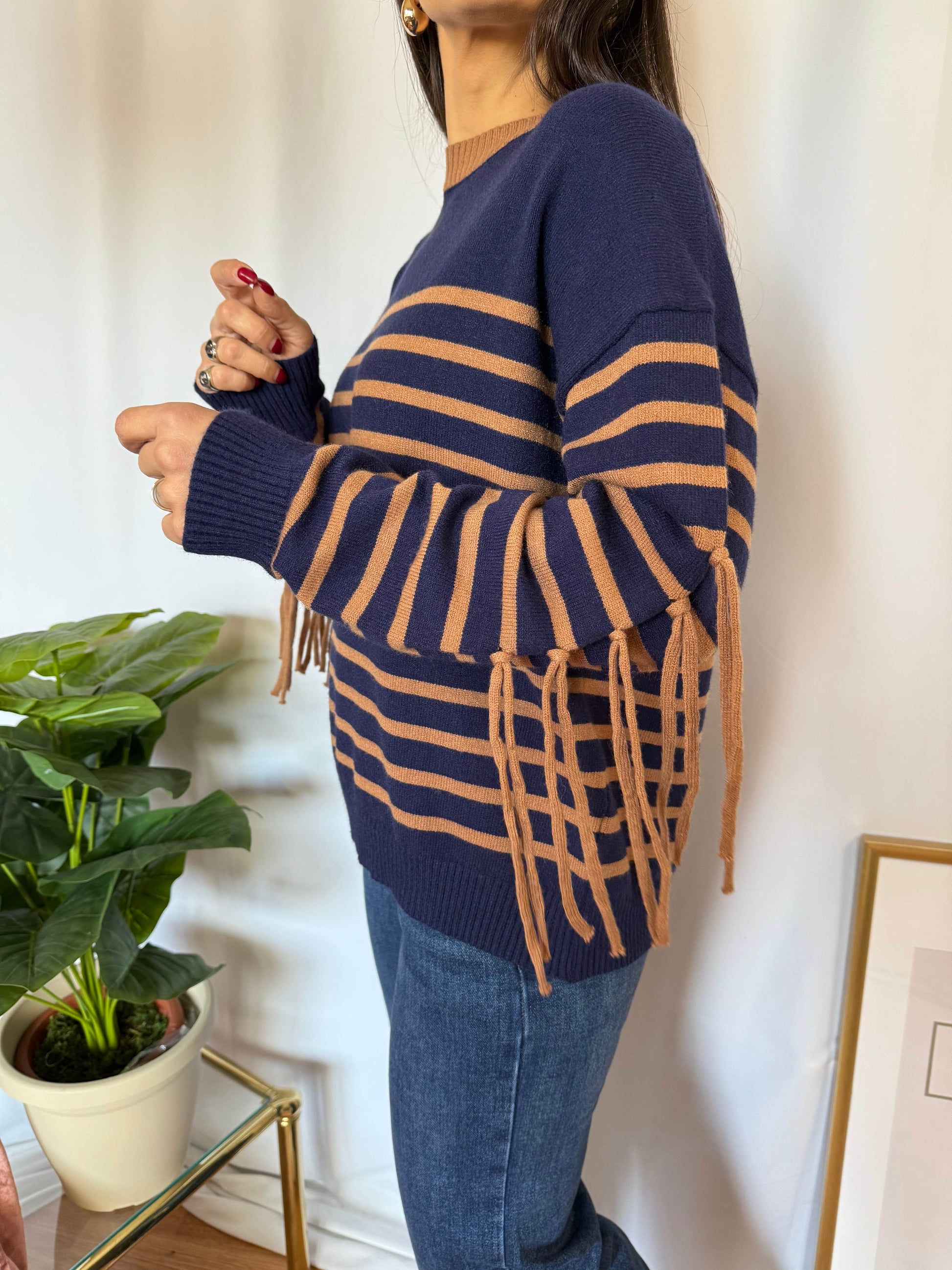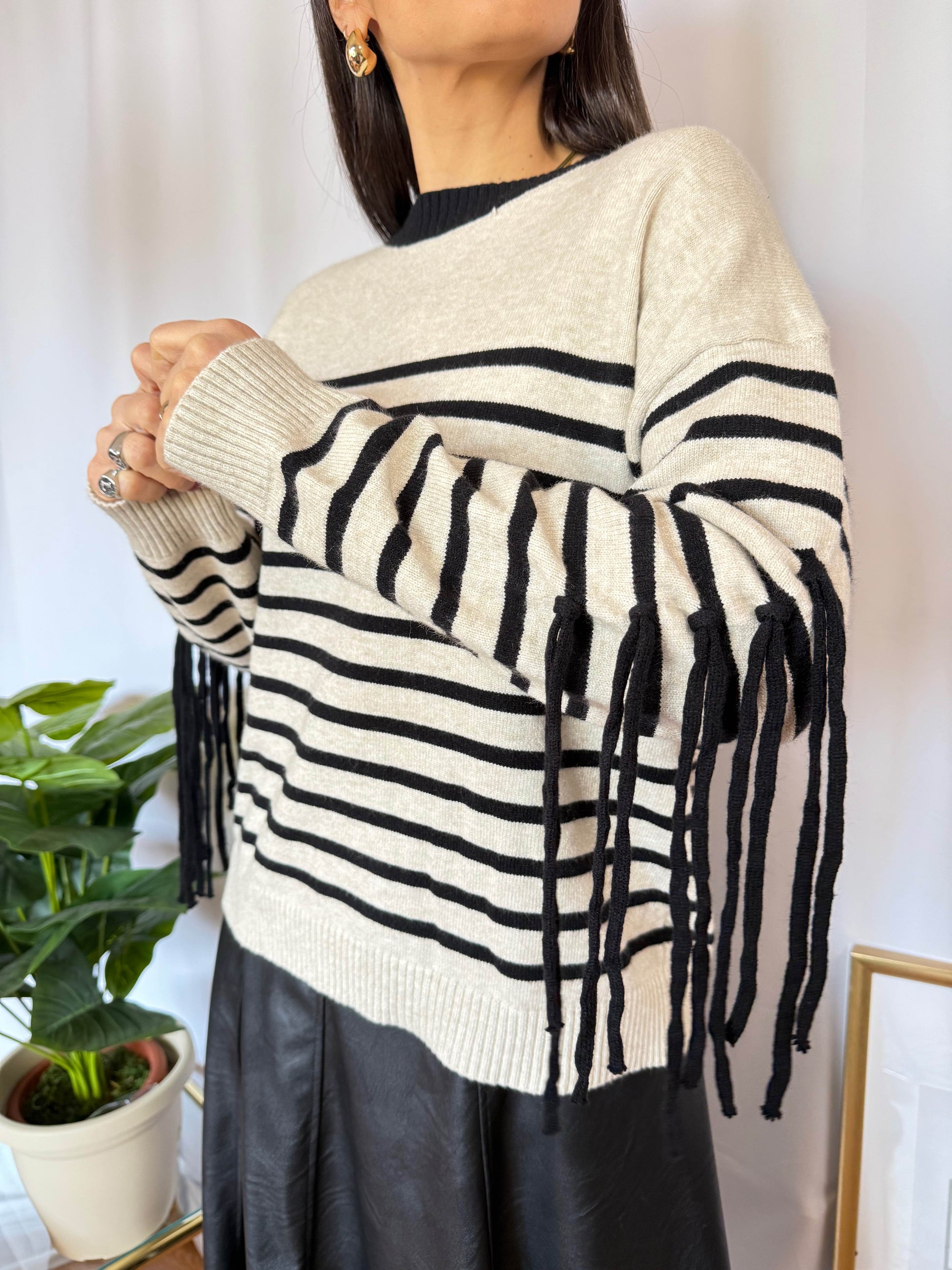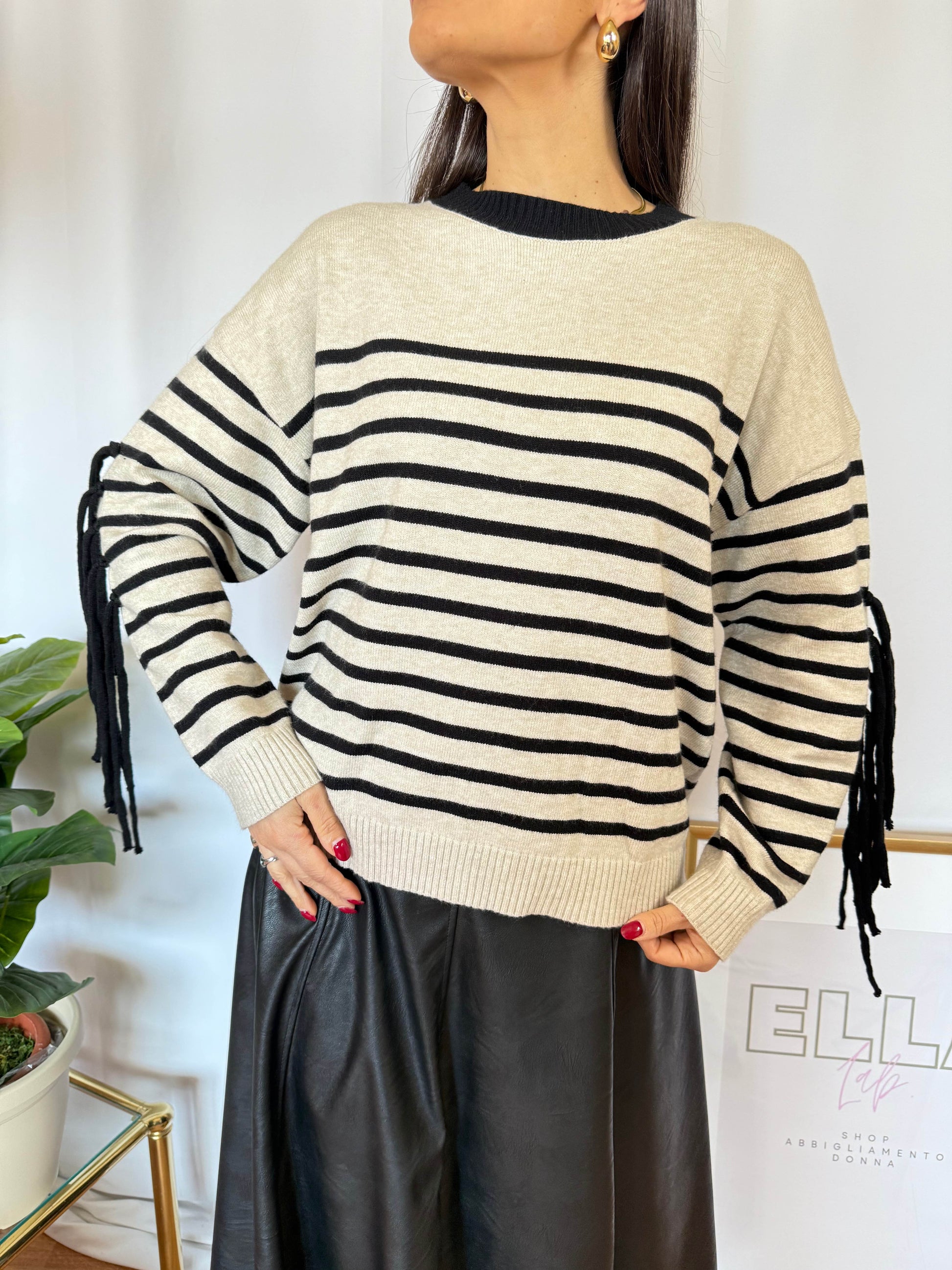 Maglioncino girocollo, fantasia a righe, dettaglio di frange in maglia sulle maniche.