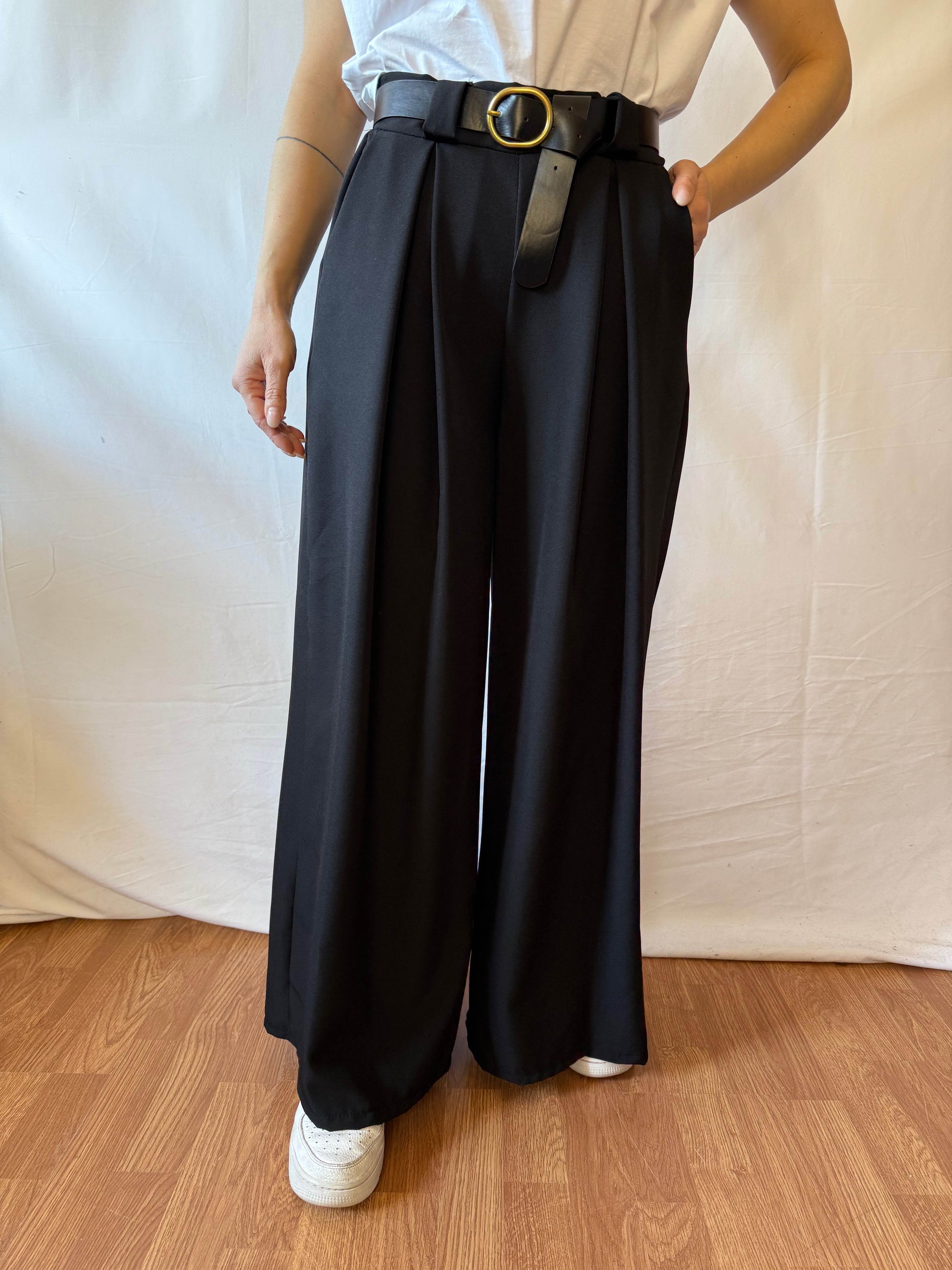 Pantalone ampio con elastico in vita, doppia pence sul davanti, tasche laterali,cintura inclusa.