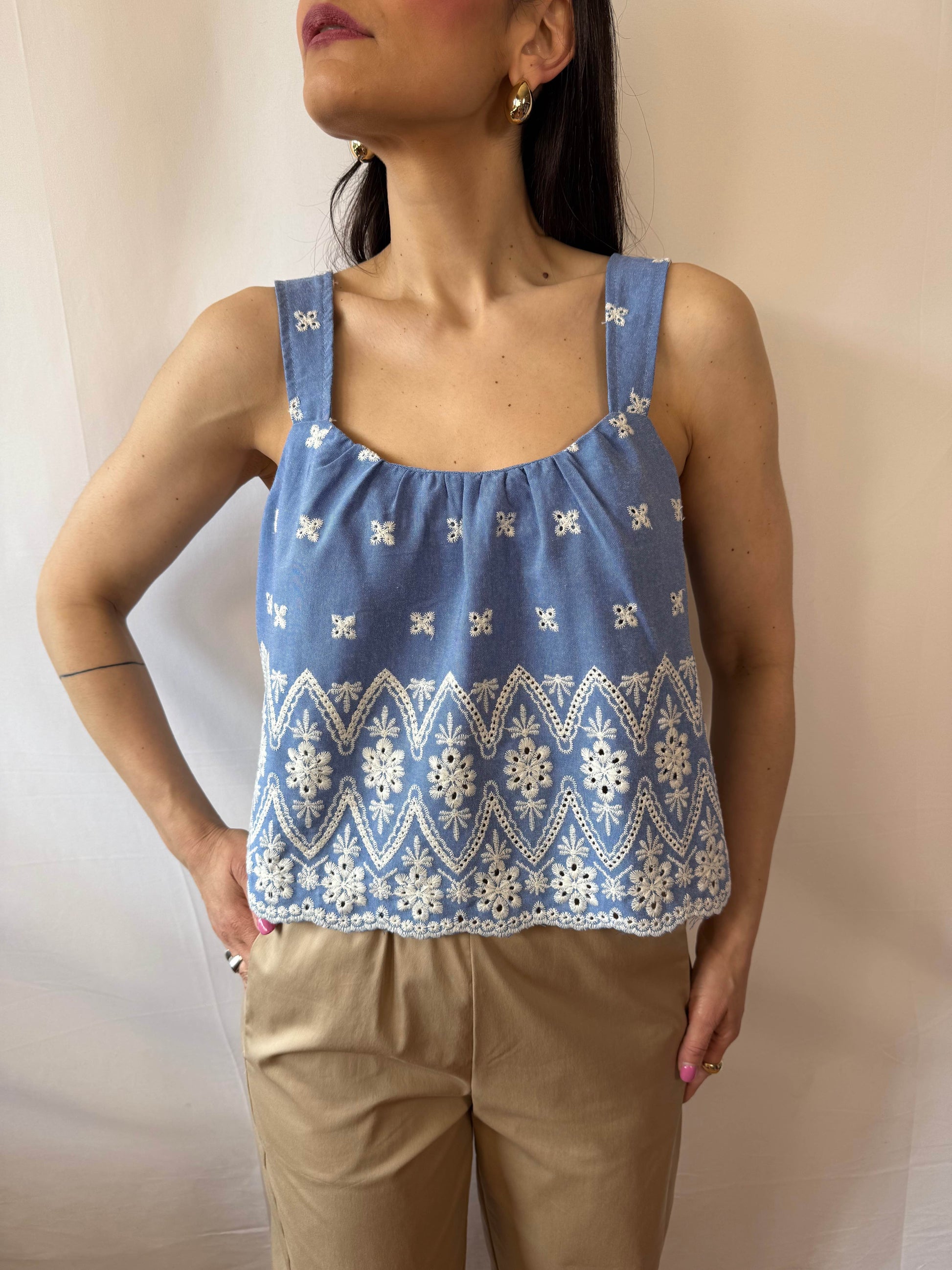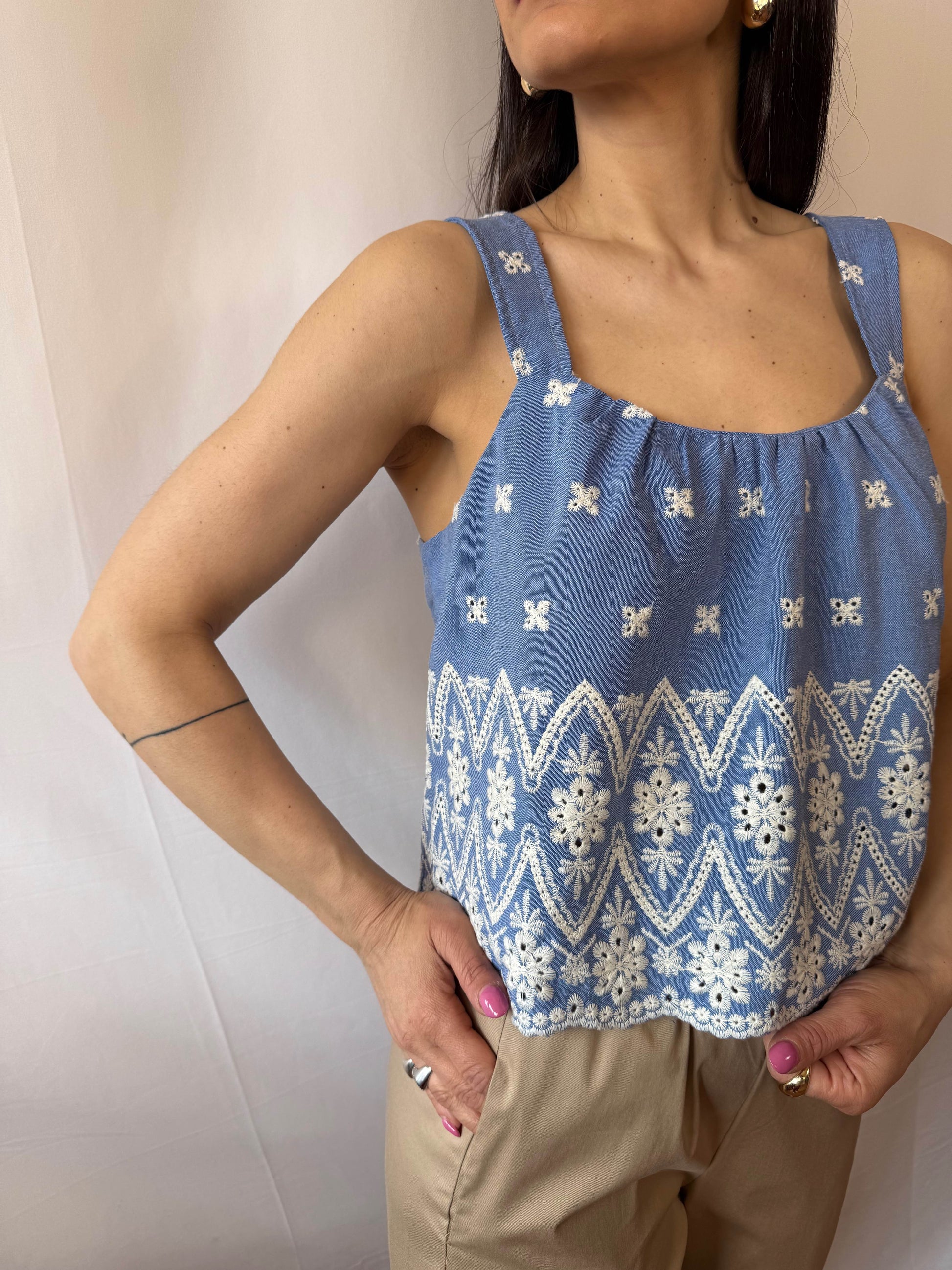 Top crop in denim con spallina larga , dettaglio ricamo.