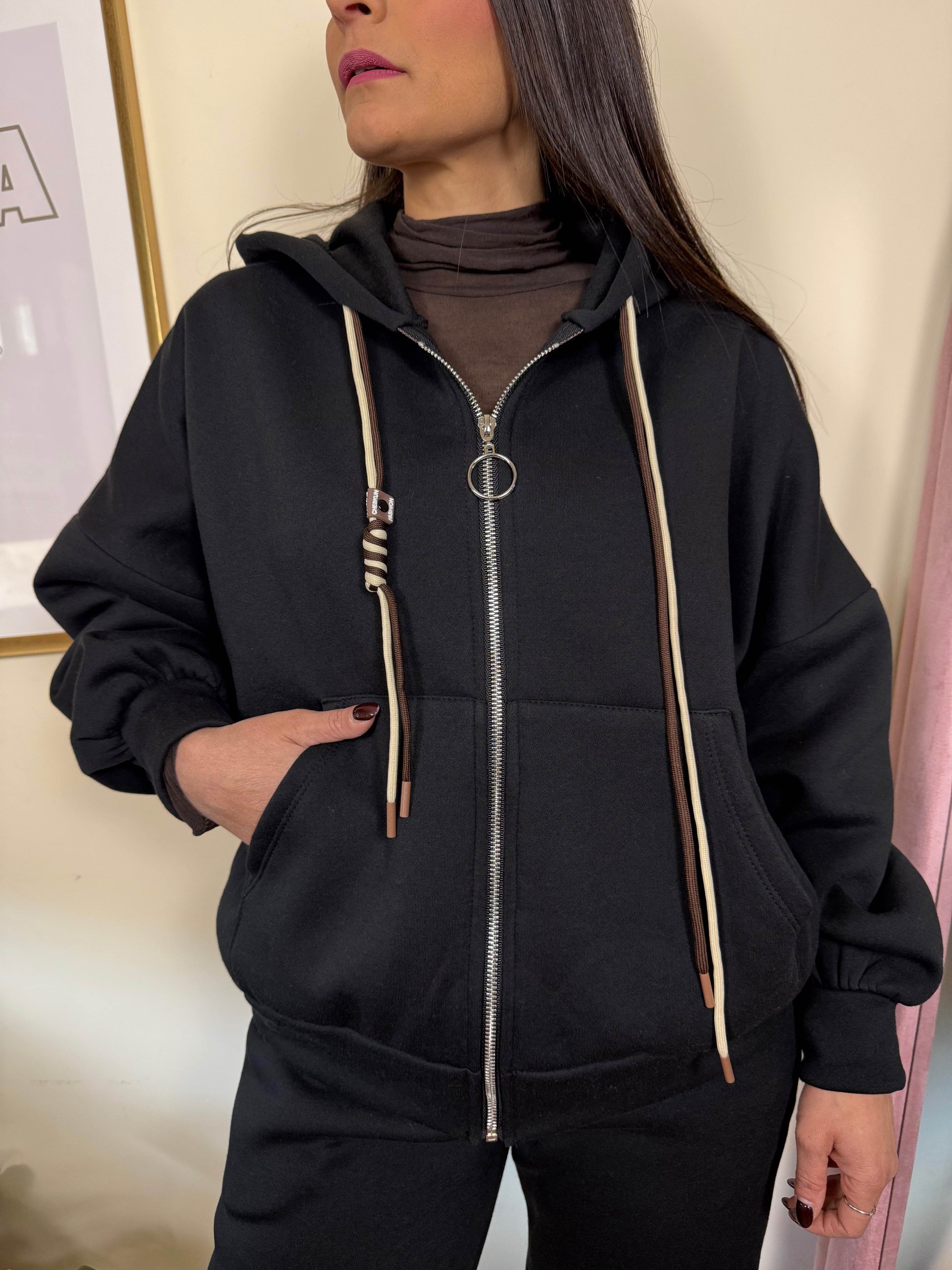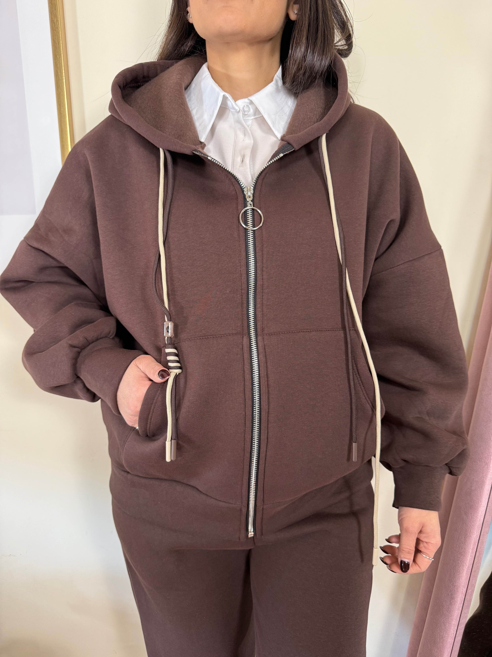 Felpa con cerniera e cappuccio, tasche laterali. Pantalone con elastico in vita,tasche laterali,elastico sul fondo. Interno felpato
